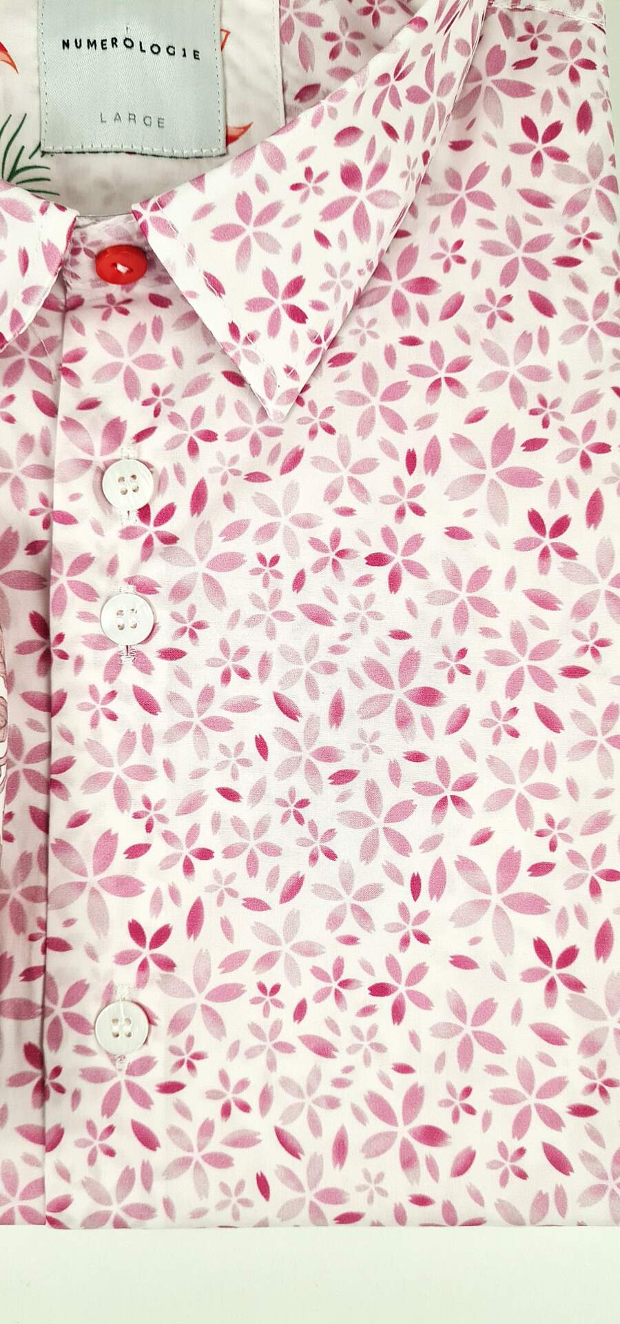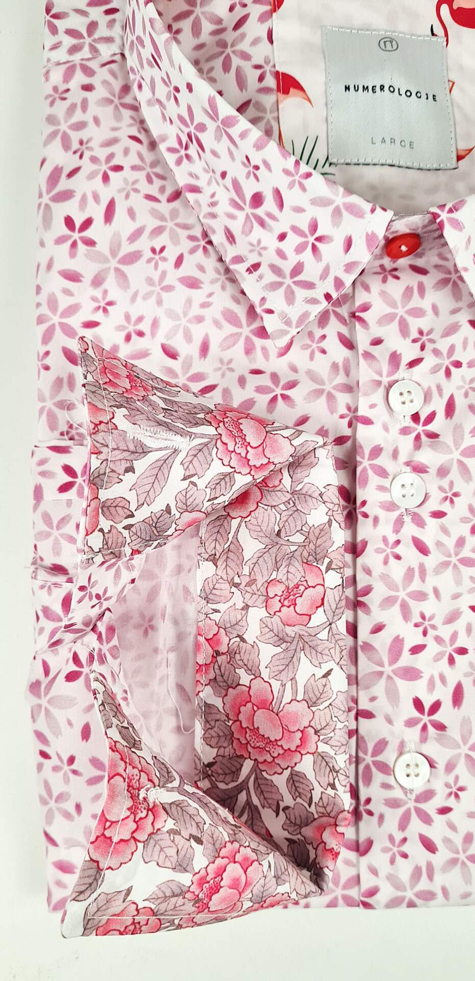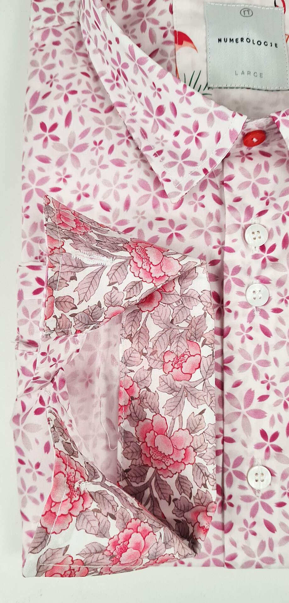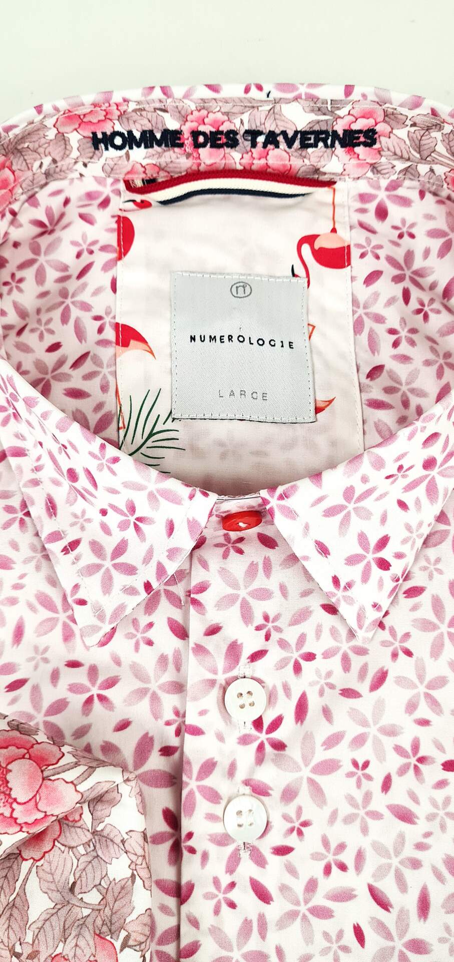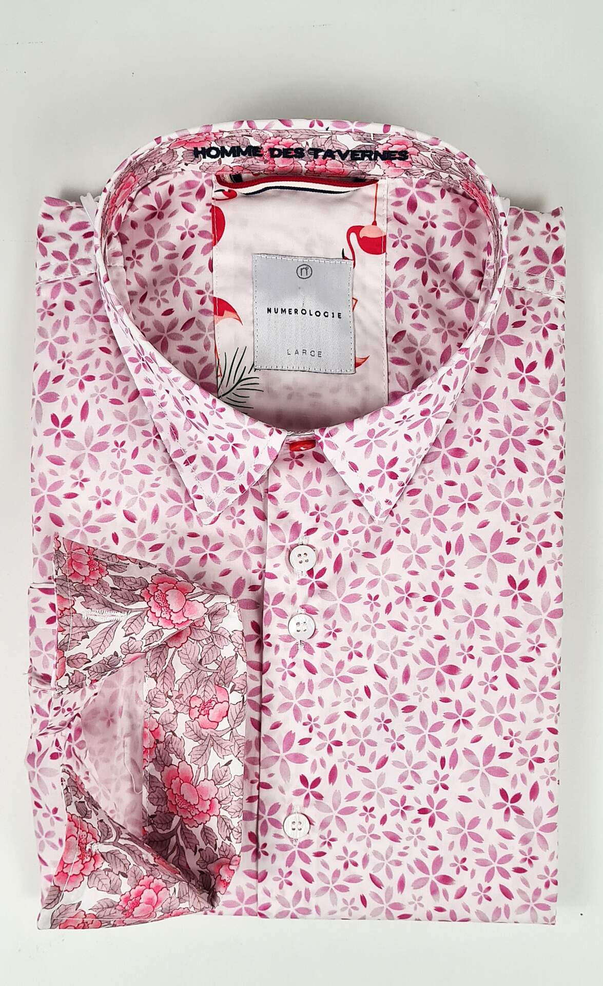 Chemise numérologie à motifs fleuris, avec tissus contrasté au poignet,  et au col, forme slim fit.