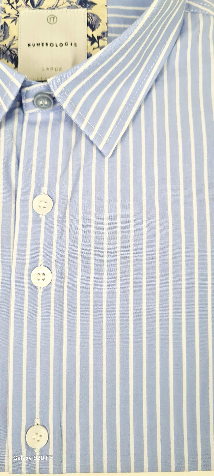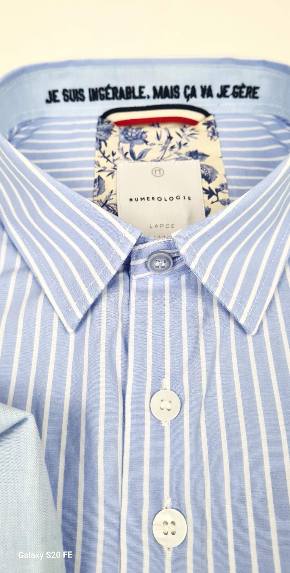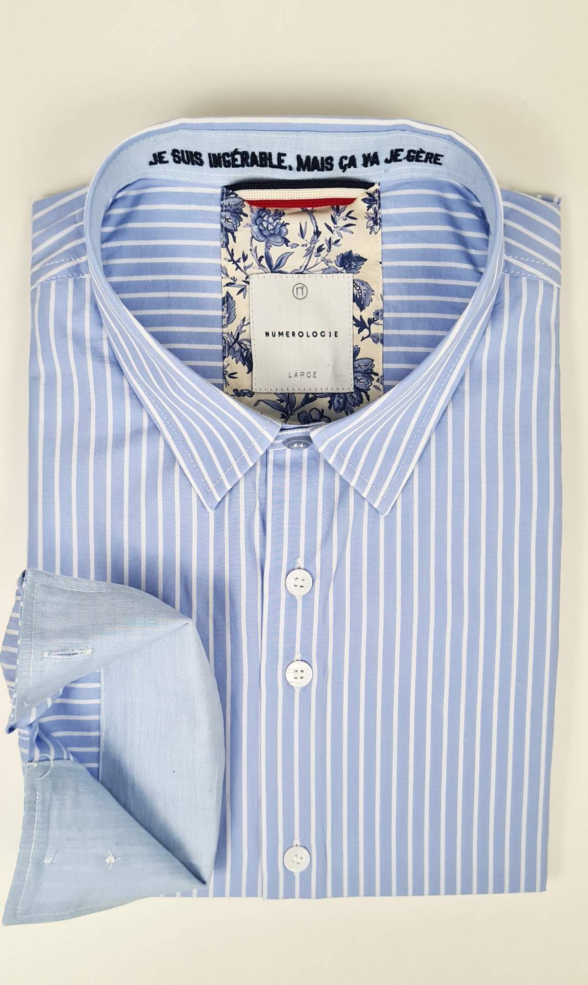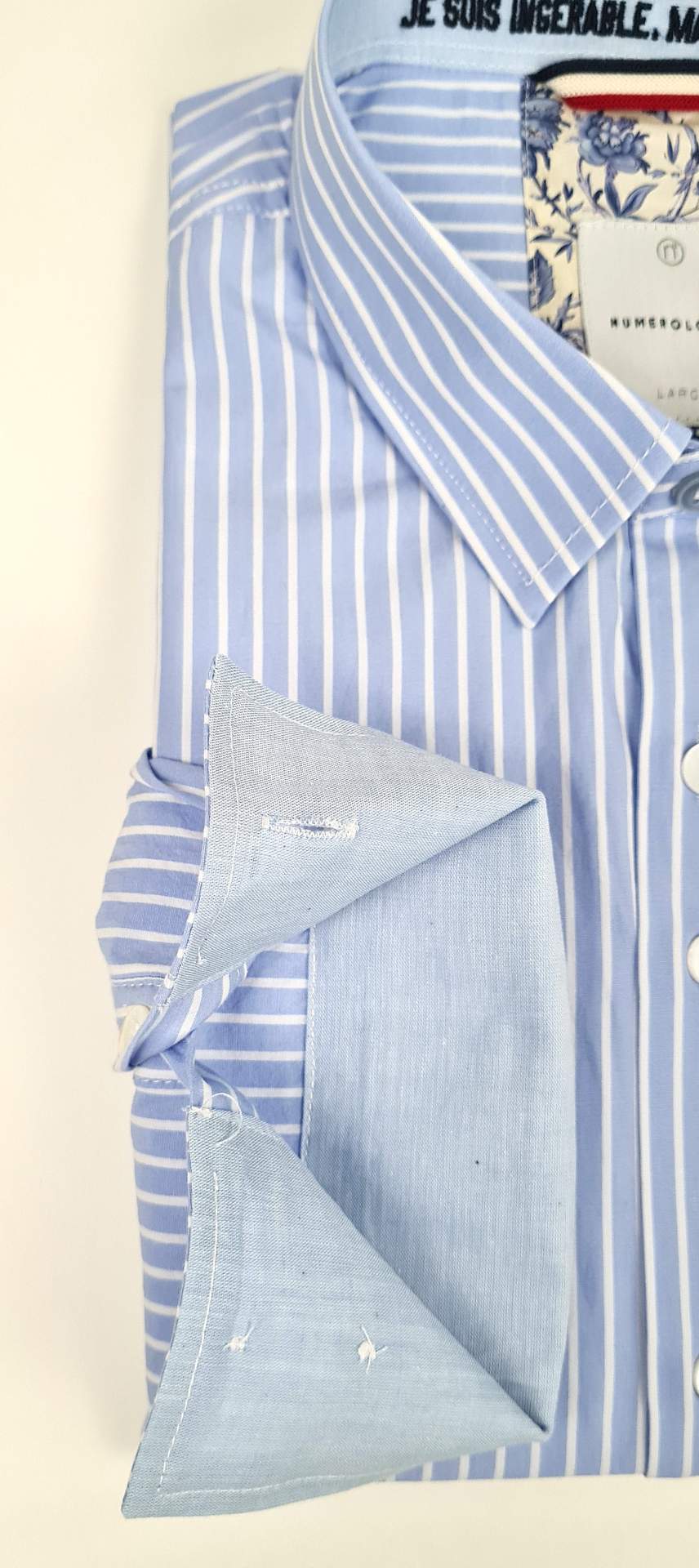 Chemise numérologie bleu ciel à rayures blanche , avec tissus fleuris contrasté au poignet, et au col, forme slim fit.