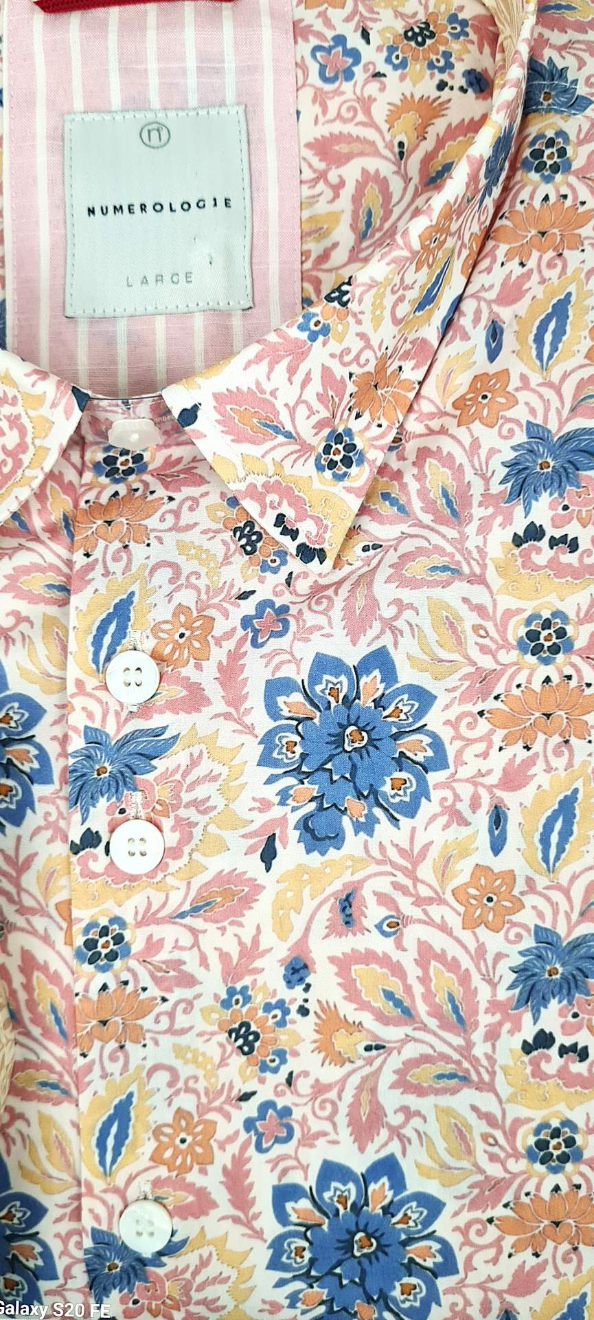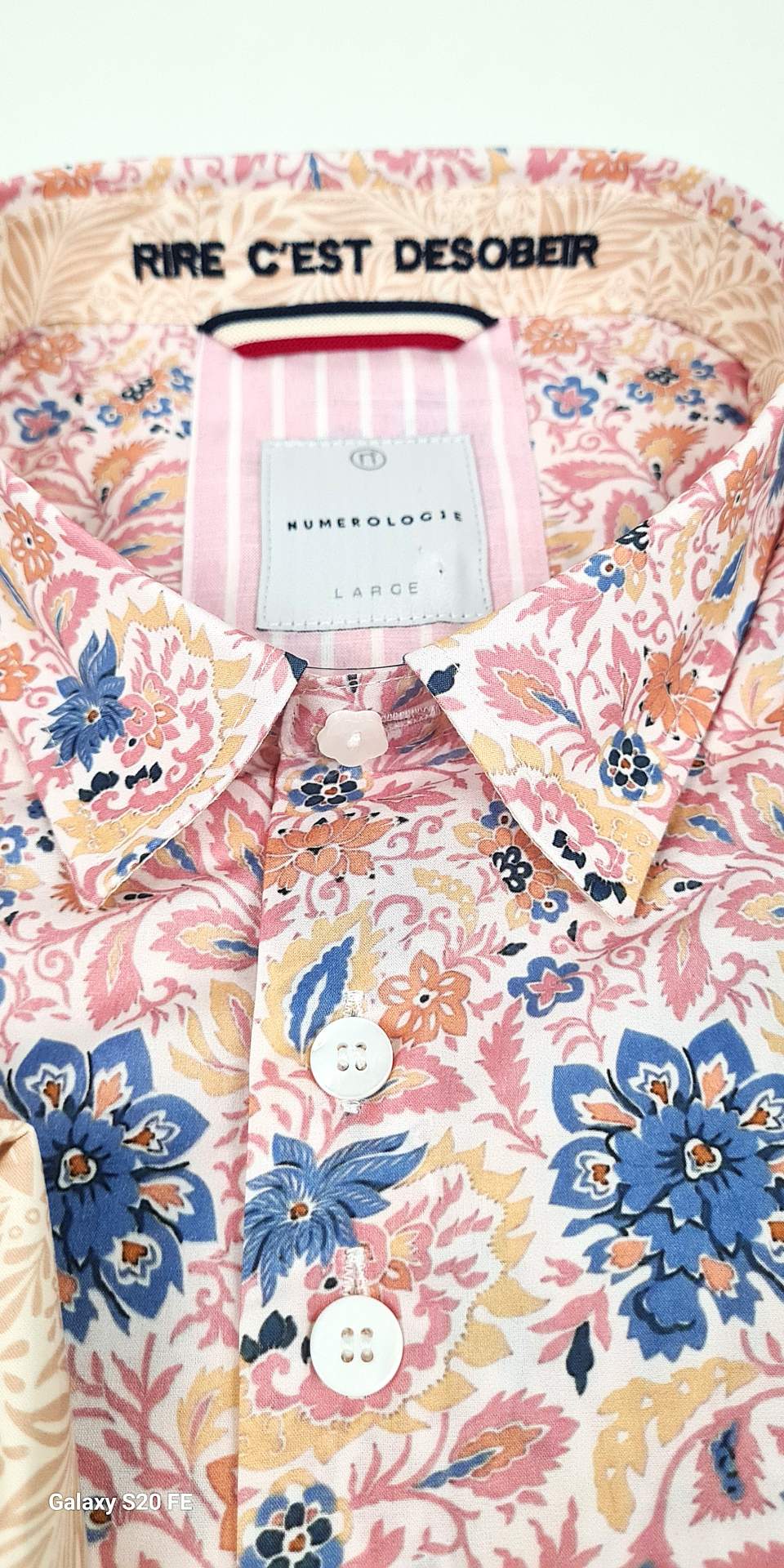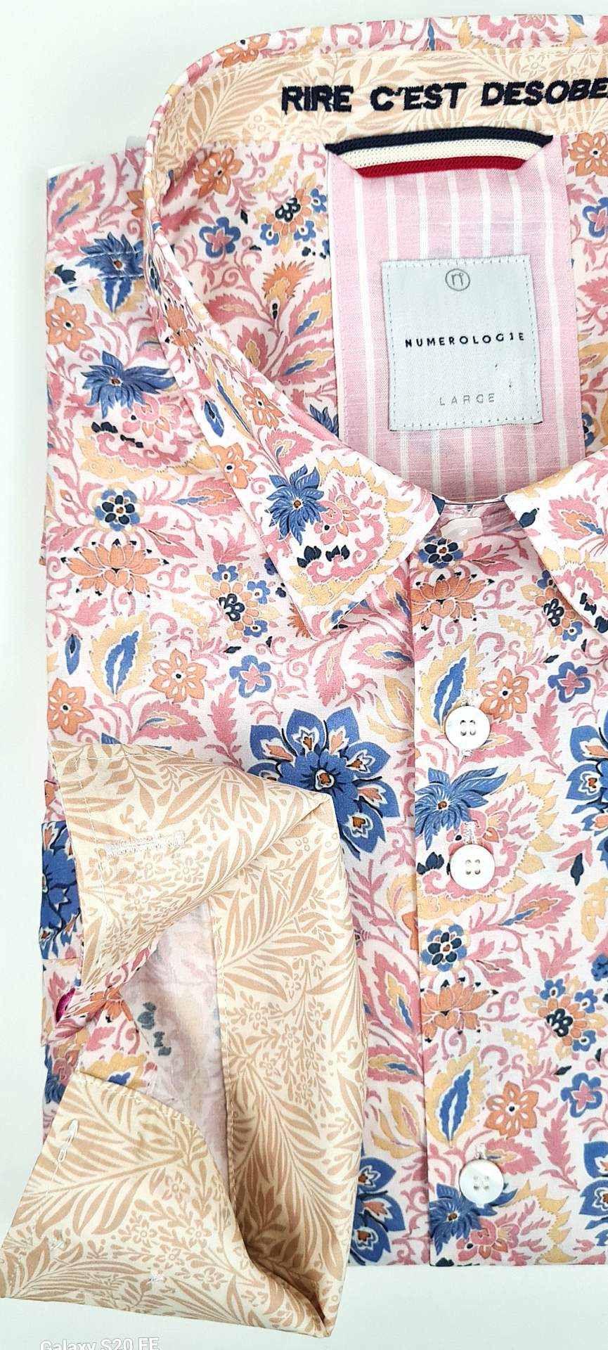 Chemise numérologie , avec tissus fleuris contrasté au poignet, et au col, forme slim fit.